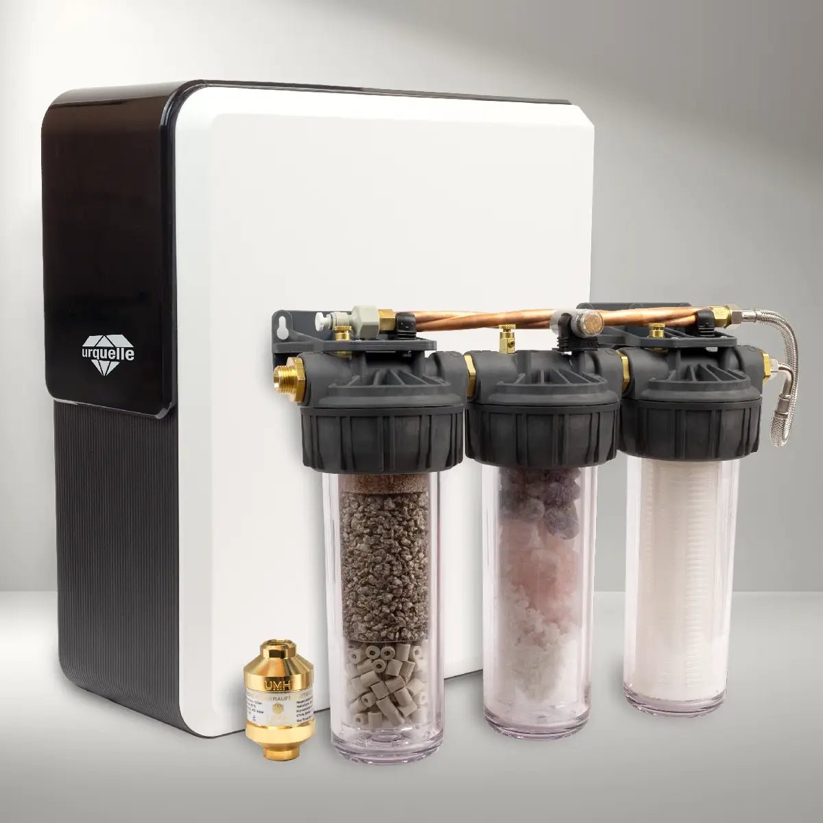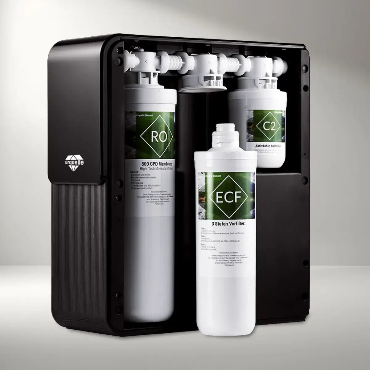 Neben einer hochpräzisen Vorfiltration, einer Hight-Tech Molekularfiltration der Firma Filmtec (800GPD), einem Aktivkohlenachfilter und einem besonderen Keimfilter, arbeitet das Urquelle Diamant System zur vollspektralen Energetisierung mit einer speziellen EM-Keramik, einem wertvollen Maifan Mineralgestein, einer hochwertigen Sango Meereskoralle, Dolomitgestein, Bergkristallen, Amethysten, Rosenquarzen, Edelschungiten, heiliger Asche (Agnihotra), einer UMH Pure Gold und einem Diamanten im Perlator.